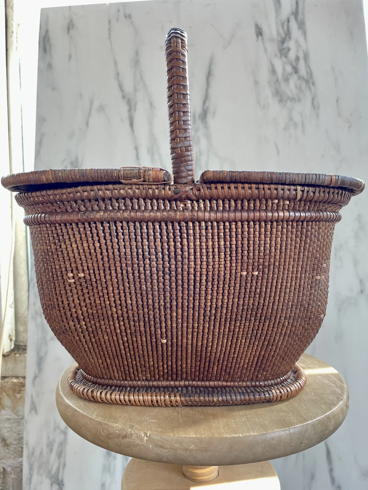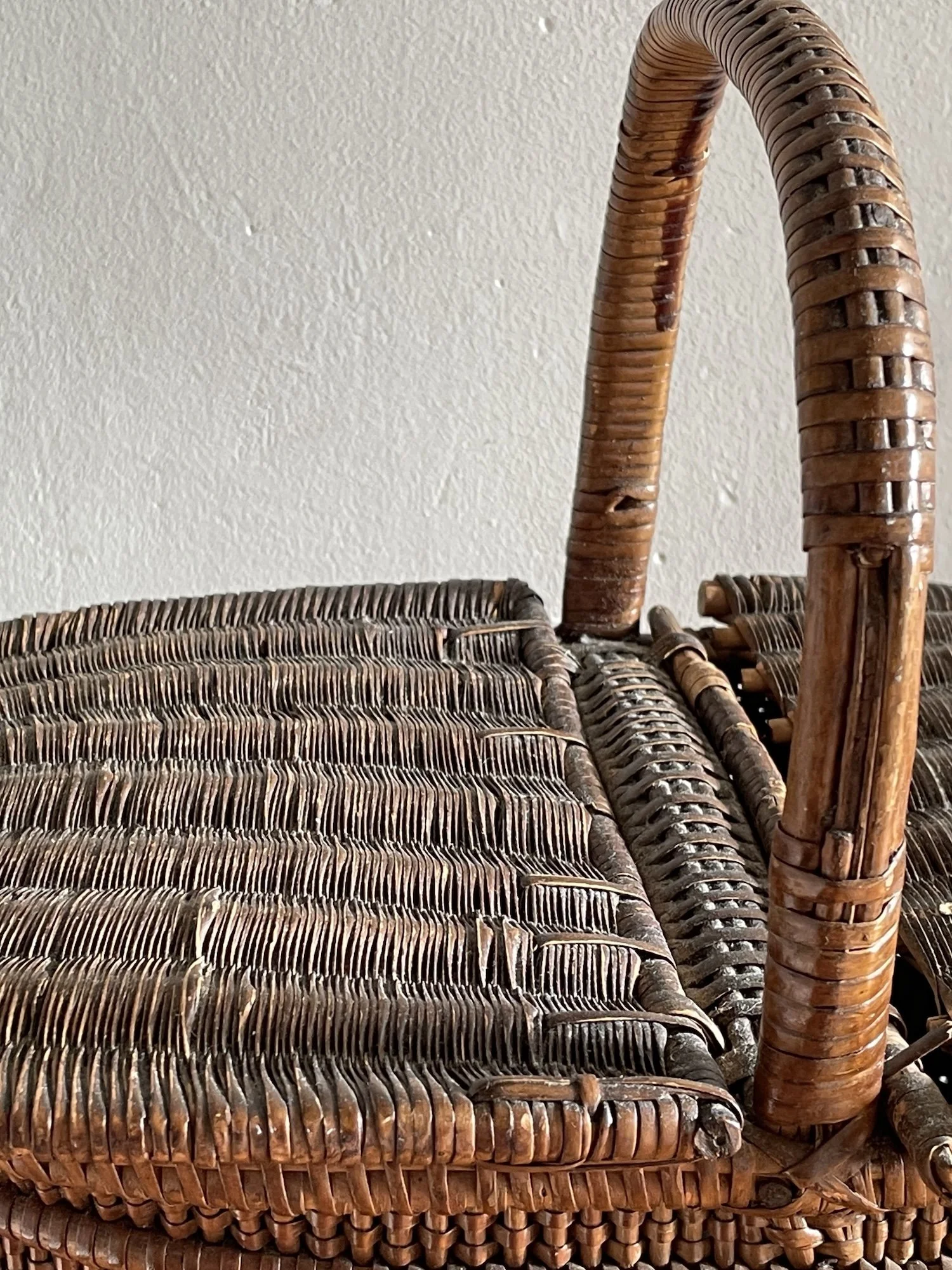It was very important to the client to keep the aged slight wonky character of the basket and handle, not affect the patina in any way and show no signs of my repair work. We decided to just stabilise and not replace missing skein work on the handle. I could potentially see a whole can of worms opening up if I had attempted to replace skeins on the handle that I feel would have significantly changed this baskets wonderful character.