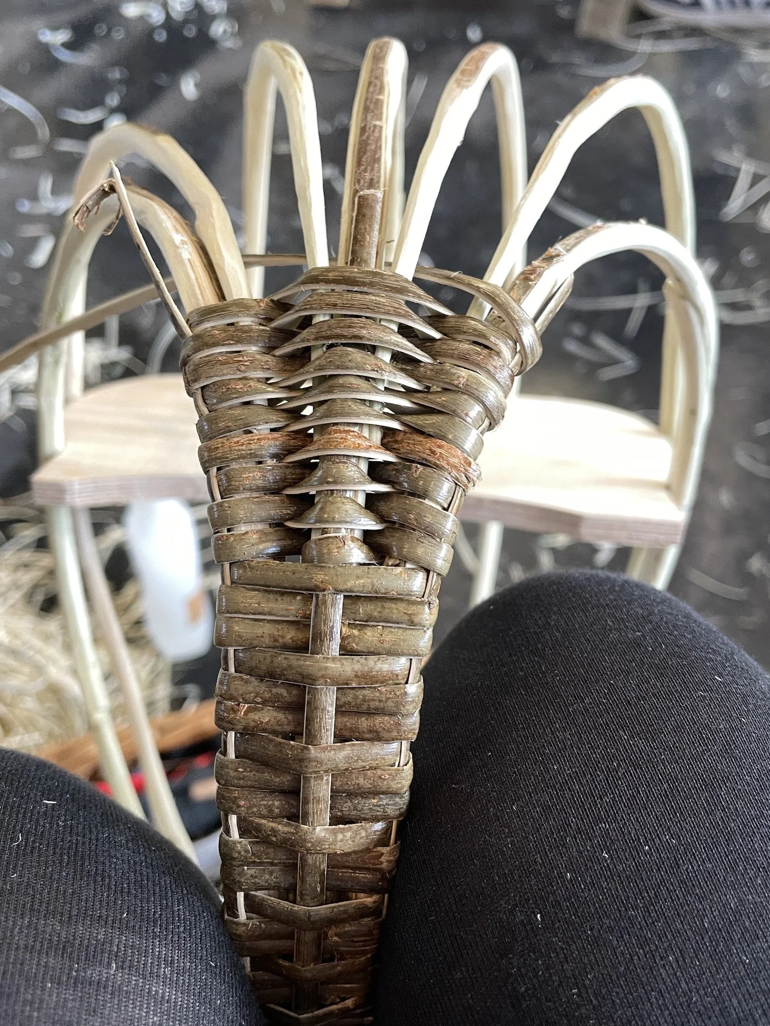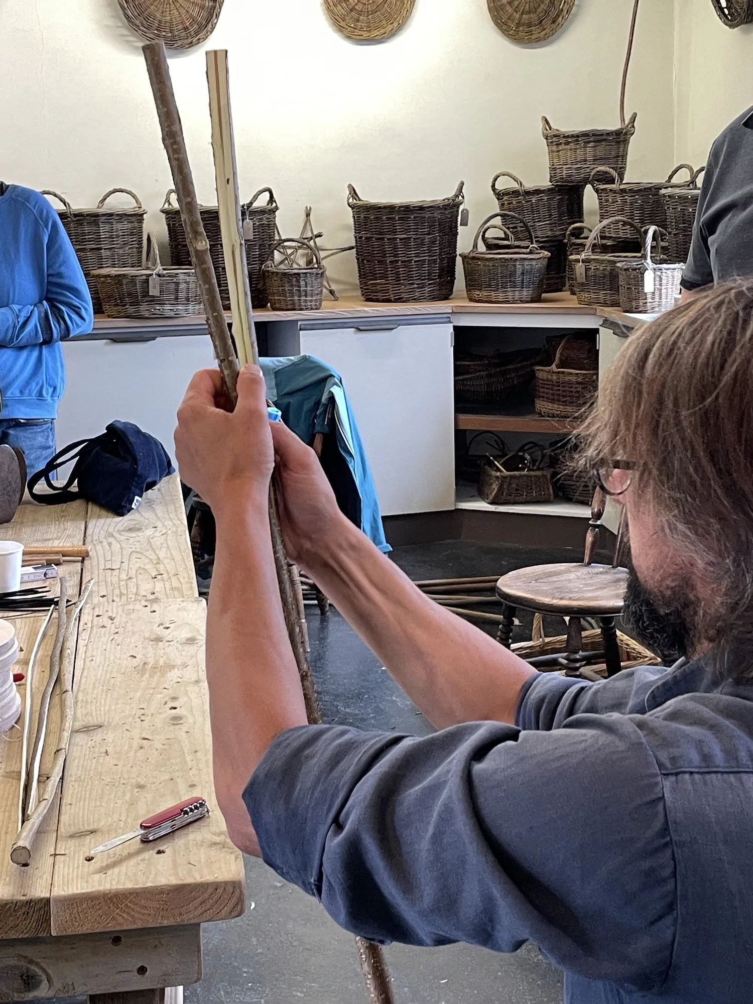 3 day workshop working in hazel and willow. Techniques and skills used to create the Gondole basket included harvesting, splitting and shaving hazel hoops and ribs, skeining bark on willow. French basketmaker Benjanmin was taught this basket by his father.
